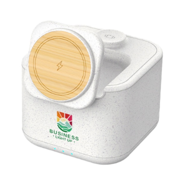 Discover the ultimate desk accessory with the Spegos 15W Wireless Charger, complete with a lamp, pen holder, and clock. This foldable station features three adjustable light colors and is crafted from eco-friendly wheat and cork materials, making it perfect for a sustainable corporate gift.