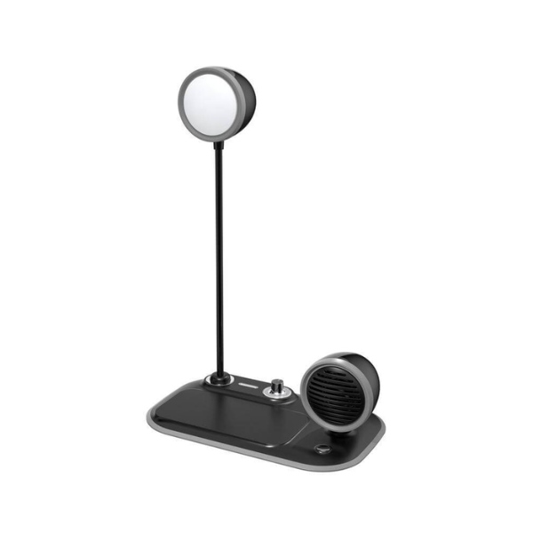 - Ideal for home or office, showcasing a powerful bass speaker, fast wireless charging, and a 3W LED table lamp.
