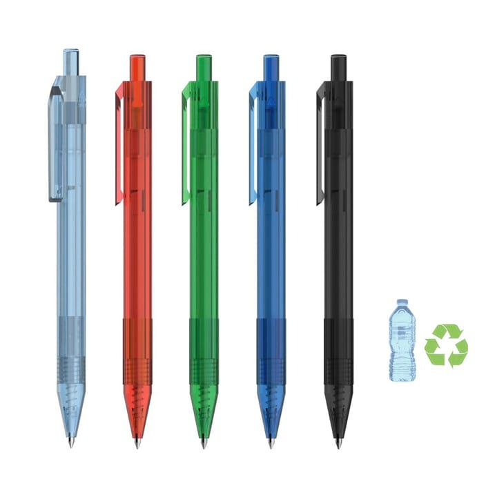 The Divvie is one of the most affordable corporate giveaways made from recycled pet bottles (RPET). This lightweight pen has a transparent body in blue ink, comes in simple polybag packaging and is available in six bright colors. Divvie can be added to customized corporate stationery gift sets.