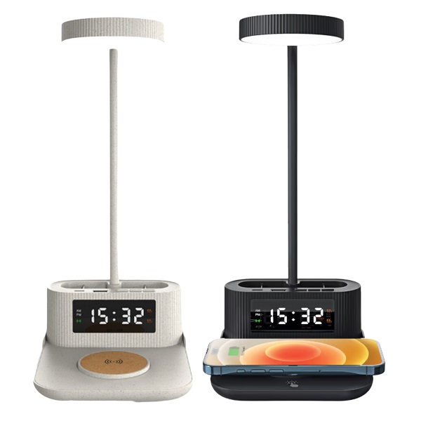 The Spegos 15W Wireless Charger with Lamp, Pen Holder, and Clock offers a sleek and functional solution for any modern workspace. It features a foldable design with three adjustable light colors, a practical pen holder, and a stylish clock, all crafted from eco-friendly wheat and cork materials. This multifunctional station is perfect for keeping your desk organized while adding a touch of elegance. Ideal as an eco-friendly corporate gift, it combines utility with sustainability.